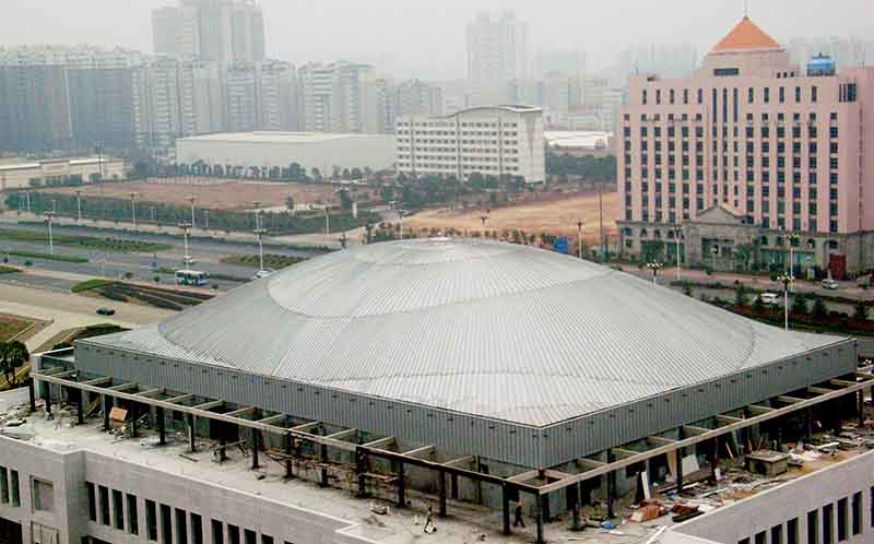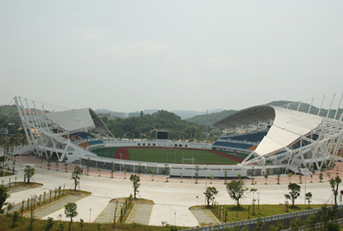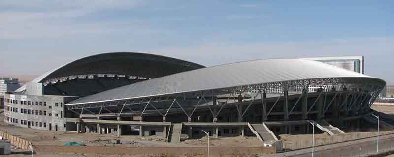本工程分為體育館和體育場,體育館為網(wǎng)架結(jié)構(gòu),體育場為管桁架和索膜結(jié)構(gòu),體育場可容納觀眾2400人。